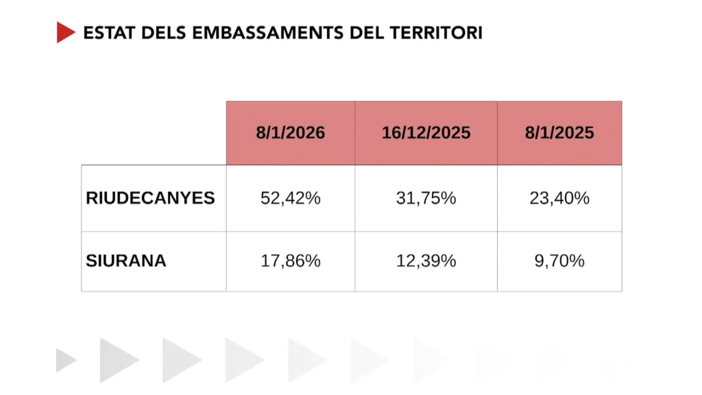 Actualment, els pantans de Riudecanyes i Siurana es troben al 52 % i al 17 %, respectivament. La garantia d’aigua a l’estiu dependrà de les precipitacions durant la primavera