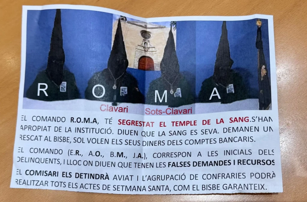 Els cartells porten l’etiqueta “Comando Roma”, amb quatre inicials que corresponen a integrants de la junta cessada per l’arquebisbe. El missatge indica que el comissari de la Sang, Javier Balañá, els detindrà aviat per organitzar la Setmana Santa.