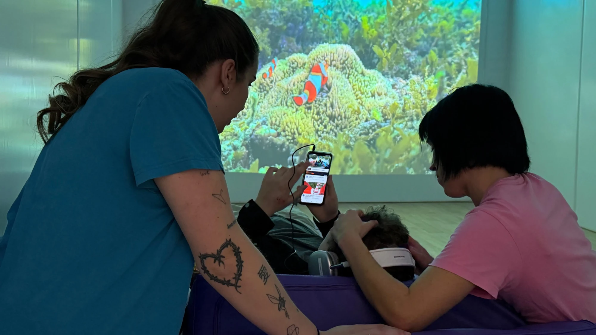 Dins de la sala encoixinada, a mode de seguretat, es poden trobar tres vídeos diferents, tot i que s’estudia continuar incorporant material audiovisual, que genera estímuls de relaxació. Aquests són escollits pels mateixos usuaris. Entre els objectes de la sala destaca un coixí seient que els abraça i genera aquesta sensació de confort, cremes que estimulen l’olfacte i objectes que per les seves formes i textures són capaços de retenir la seva atenció.