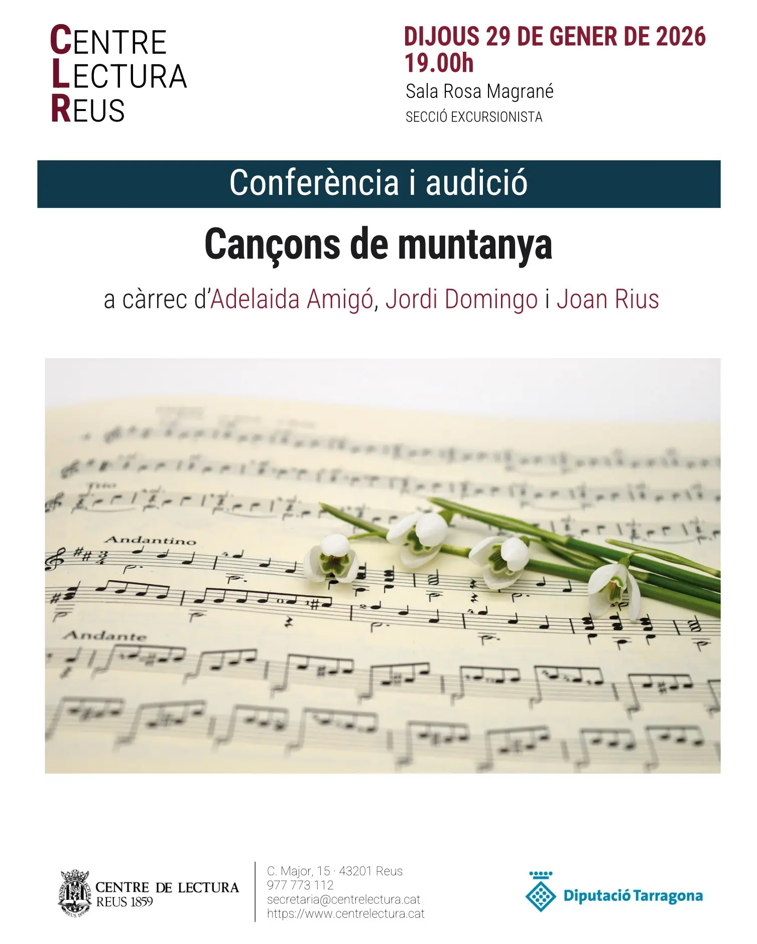 Sala Rosa Magrané Conferència i audició de cançons de muntanya, a càrrec d’Adelaida Amigó, Jordi Domingo i Jan Rius.