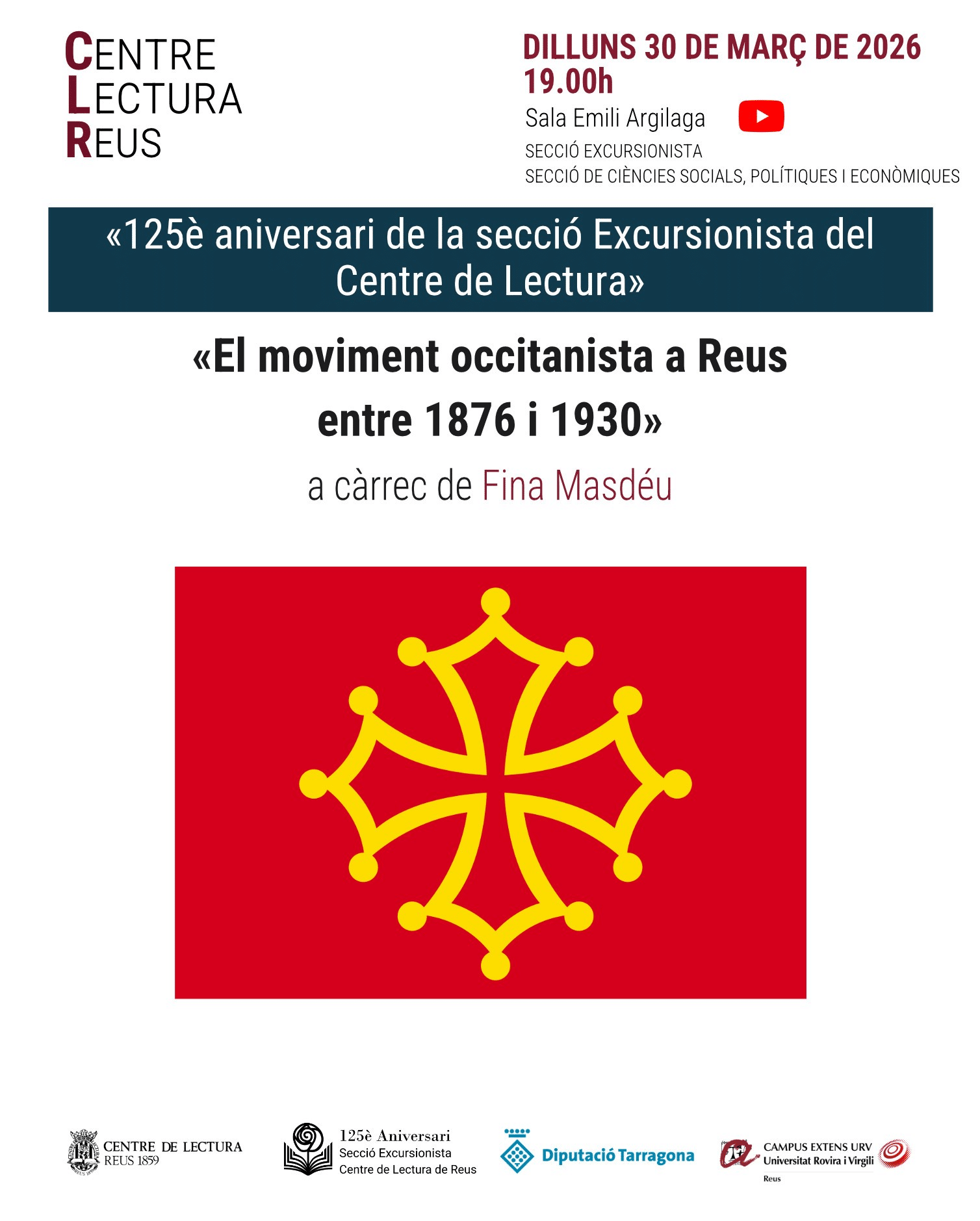 Sala Emili Argilaga / Sala virtual «125è aniversari de la secció Excursionista del Centre de Lectura» Conferència «El moviment occitanista a Reus entre 1876 i 1930», a càrrec de Fina Masdéu.