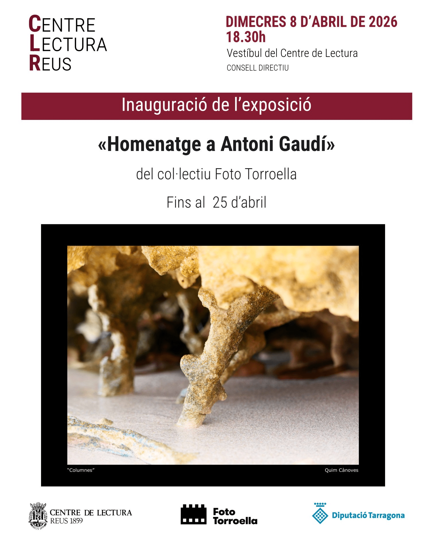 Vestíbul del Centre de Lectura «Any Gaudí» Inauguració de l’exposició «Homenatge a Gaudí» del Col·lectiu Foto Torroella. Fins al 25 d’abril.