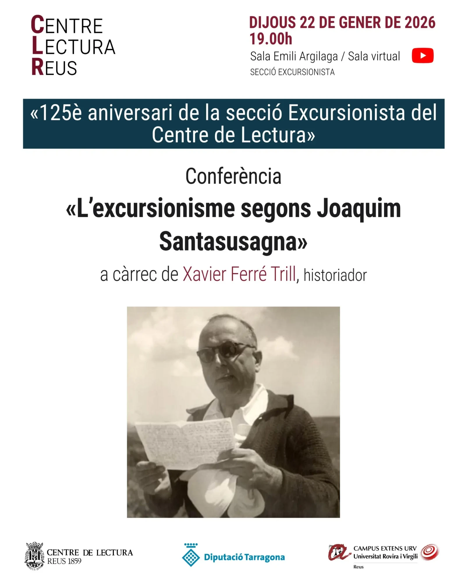 Sala Emili Argilaga / Sala virtual «125è aniversari de la secció Excursionista del Centre de Lectura» Conferència «L’excursionisme segons Joaquim Santasusagna», a càrrec de Xavier Ferré Trill, historiador.